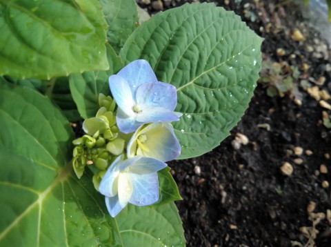 季節外れに花をつけた道路脇のアジサイ。気温が下がってきたので戸惑...