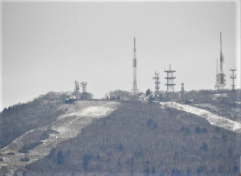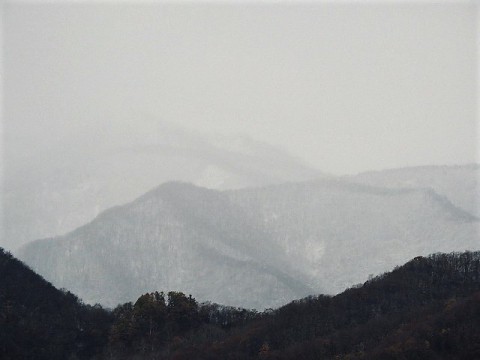 雪化粧した遠くの山々が霞んで見えます。9時の気温は2.3度。寒い...