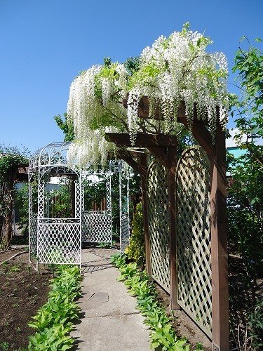 会社の園内で、一際目立って綺麗に咲いている、白い藤の花です。青い...