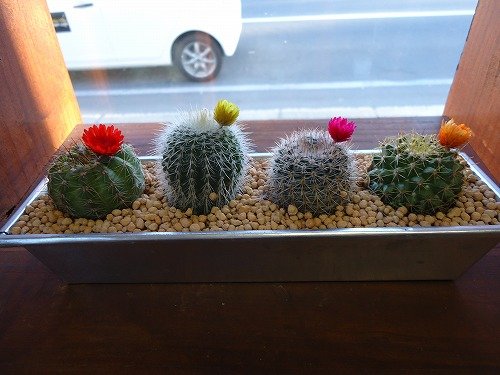 丸くて可愛いサボテンに色とりどりのお花が咲いていて、更に可愛い!...