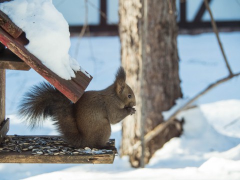 雪降る中やって来たエゾリス君「ひまわりの種見つけたぞ~」