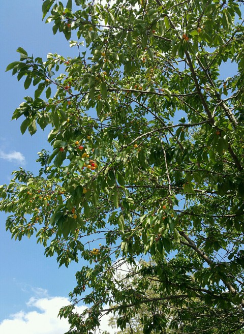 お店の前のさくらんぼの木、今ちょうどいい感じに実がなってますよ(*´∀`)♪